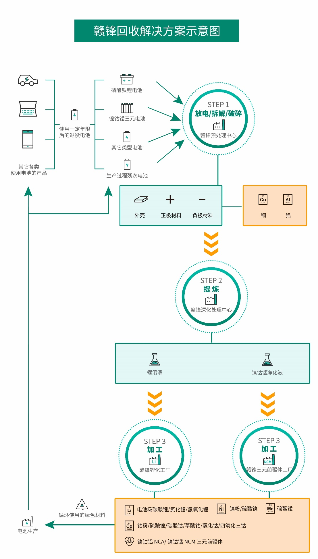回收所產(chǎn)生的三元前軀體、鋰鹽等產(chǎn)品,將在質(zhì)檢合格后,重新被應(yīng)用于生產(chǎn)動力電池、消費設(shè)備電池或工業(yè)加工流程中。